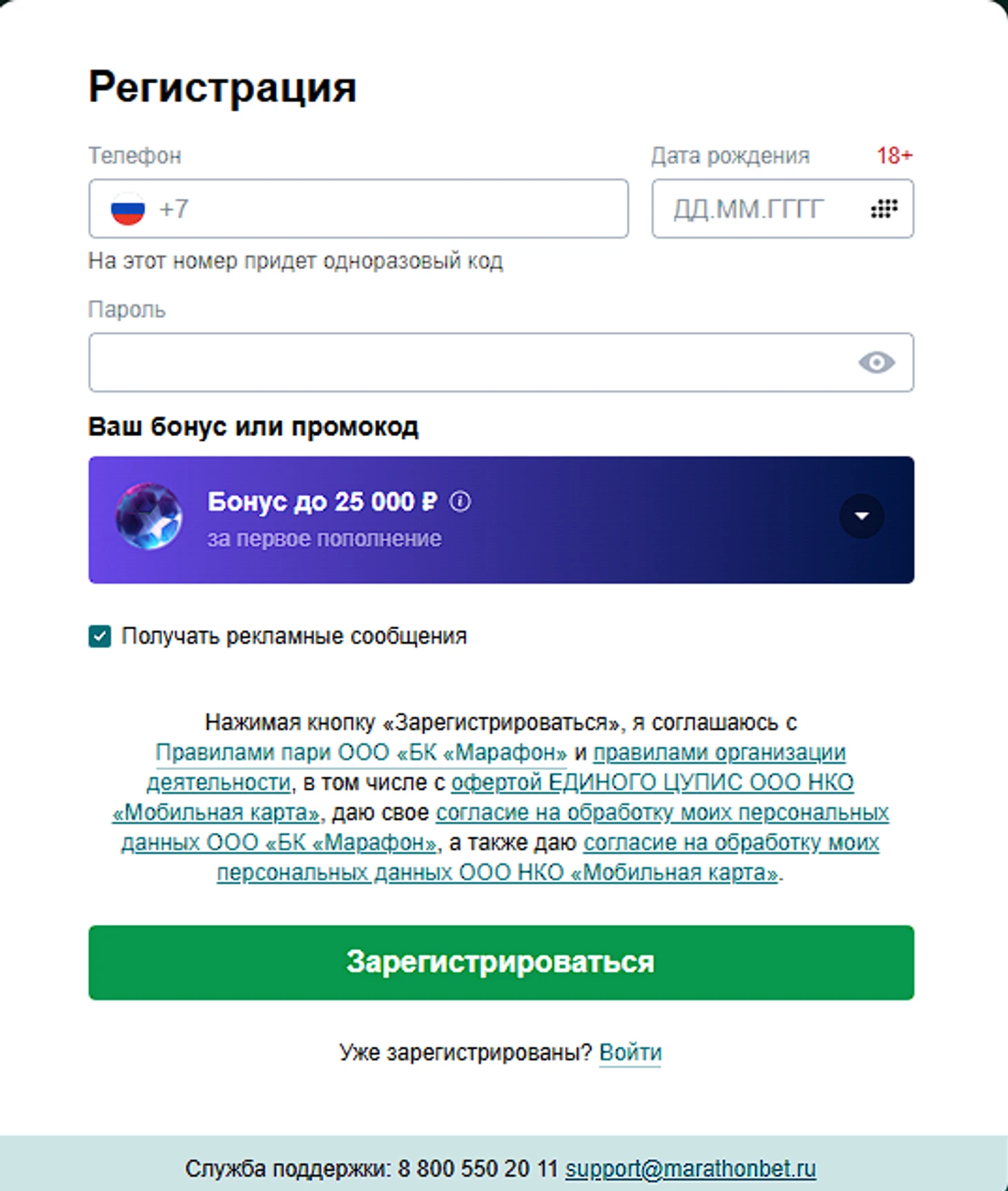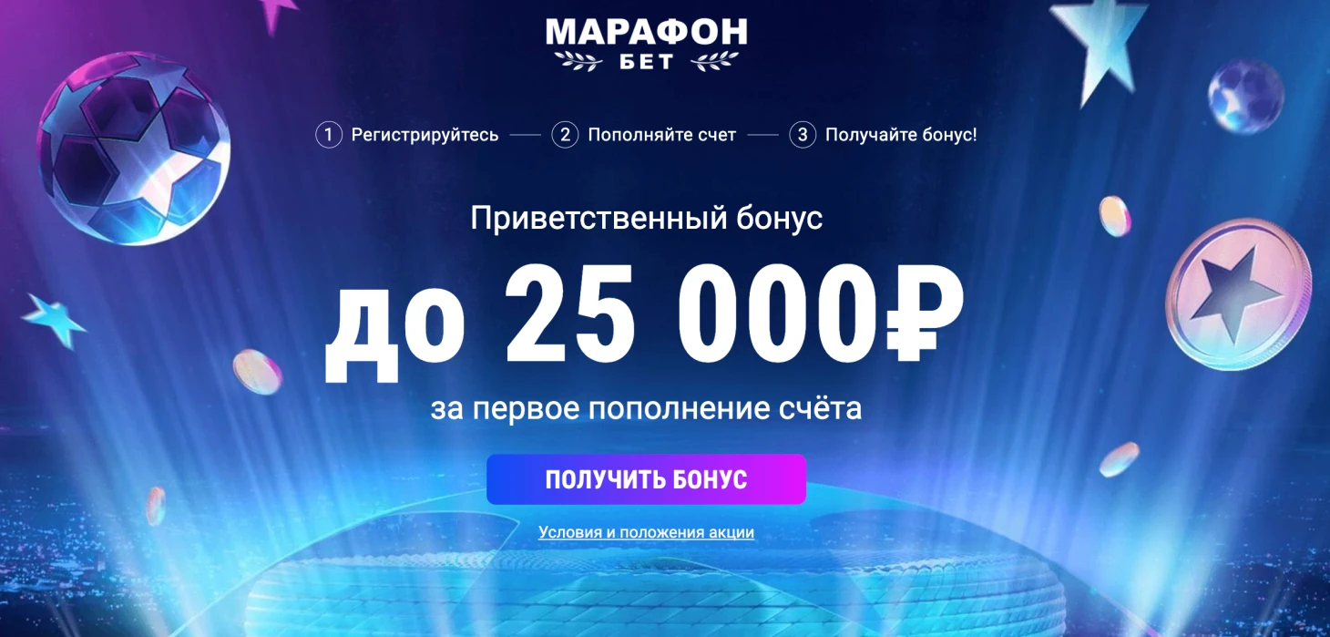 Приветственный бонус за первое пополнение в БК «Марафон» – до 25 000 рублей