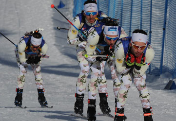 Эстафетная гонка — командное состязание. Состав команда — четыре спортсмена. Каждый представитель команды бежит один этап длиной 7,5 километров у мужчин, и 6 километров у женщин с двумя огневыми рубежами. Стрельба ведется на первом рубеже из положения лежа, на втором — стоя. В отличие от других гонок каждый биатлонист имеет 3 запасных патрона, которые при необходимости заряжаются вручную. Незакрытые мишени наказываются 150–метровыми штрафными кругами. На первом этапе спортсмены уходят на дистанцию с общего старта. В случае обгона на круг команда снимается с дистанции.