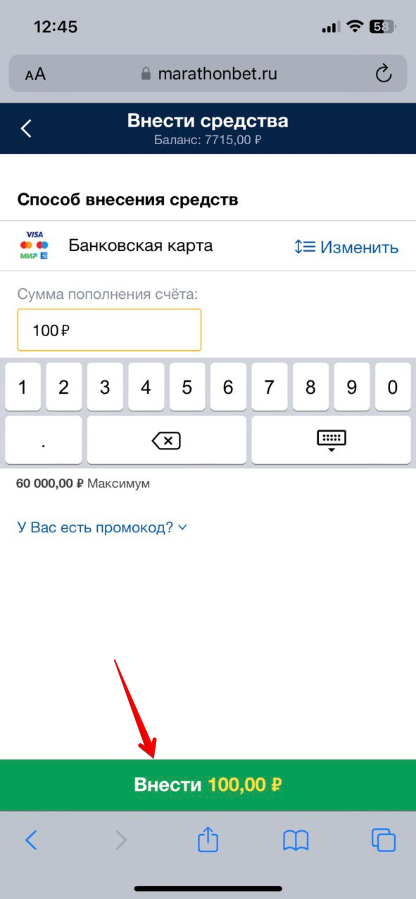 Пополнение счета в БК «Марафон» с помощью банковской карты