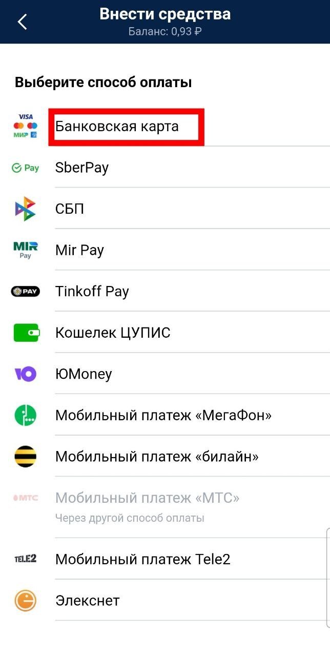 • банковские карты VISA, MasterCard, «Мир», Maestro;